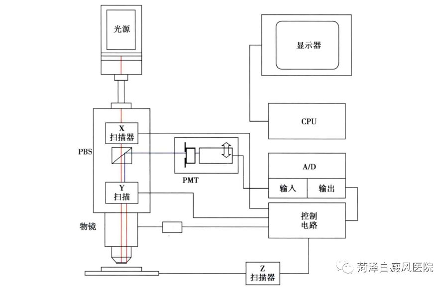 三維皮膚CT采用(yòng)830nm半導體(tǐ)激光作(zuò)為(wèi)光源,通過物(wù)鏡聚焦于組織内焦點處反射或反向散射回來的光由同一物(wù)鏡收集,然後通過探測光路系統和針孔傳輸至探測器。針孔使得探測器隻能(néng)接收由焦點反射回來的光線(xiàn)。非焦點反射光則被針孔濾除 。在組織焦平面上進行二維掃描,從而構成薄層組織“光學(xué)切片”,因此俗稱“皮膚CT”。